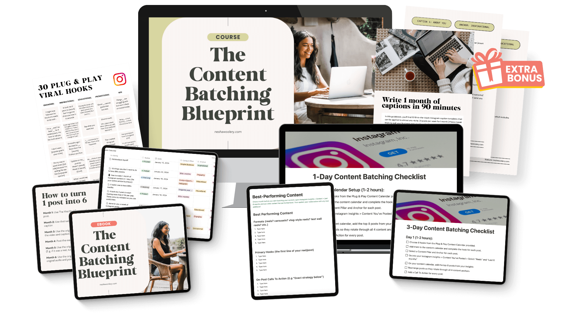 ✅ 30-Minute Video Course – Learn my full content batching system step-by-step, fast.✅ My Personal AI Prompts - Train AI to sound like you and learn how to get AI to write viral hooks, content and captions for you.✅ eBook Version – Prefer reading? You’ll get the full course as a beautifully formatted eBook too.✅ 1-day + 3-day Content Batching Checklists - Available in Notion, Google Sheets & CSV (easy to upload to tools like Asana).✅ Content Calendar Template - Plan, schedule, and track your Instagram content, top-performing posts, hashtags, and reusable captions — all in one place. (Available in Notion, Google Sheets & CSV.)✅ 30 Plug & Play Viral Hooks - Hooks that me and my students have used to hit millions of views.✅ The Repurposing Guide - Learn how to turn one post into multiple, without more effort.✅ The "Before Batching" Checklist - A checklist of tasks you MUST do to make your batch day 10x faster.